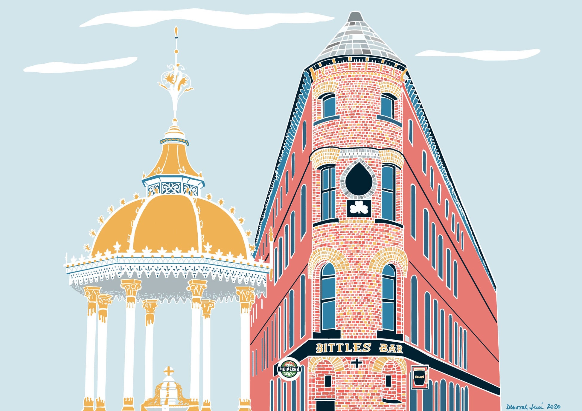 I use an iPad pro to create my digital art work. This illustrative drawing is of Bittles Bar and the Jaffe Memorial Fountain in Belfast, Northern Ireland.